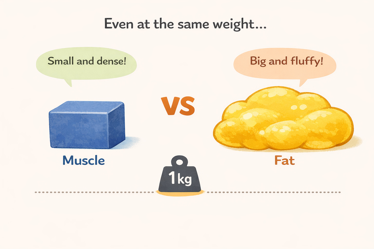 実は、筋肉と脂肪は同じ「重さ」でも中身の詰まり方が違います。